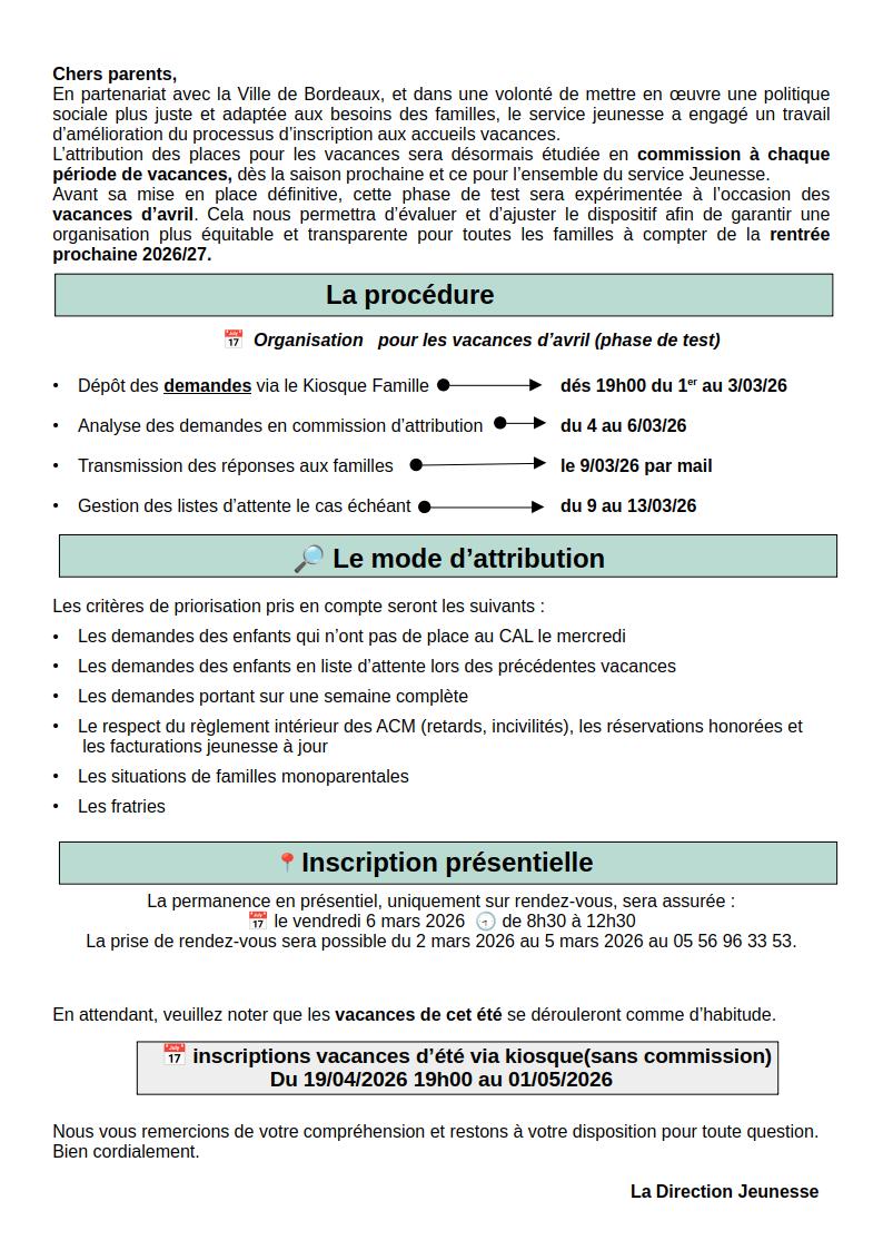 INFORMATION RÉSERVATIONS VACANCES D'AVRIL