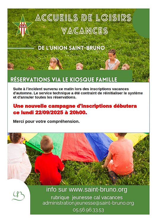 Suite à l'incident survenu ce matin lors des inscriptions vacances d'automne. Le service technique a été contraint de réinitialiser le système et d'annuler toutes les réservations.