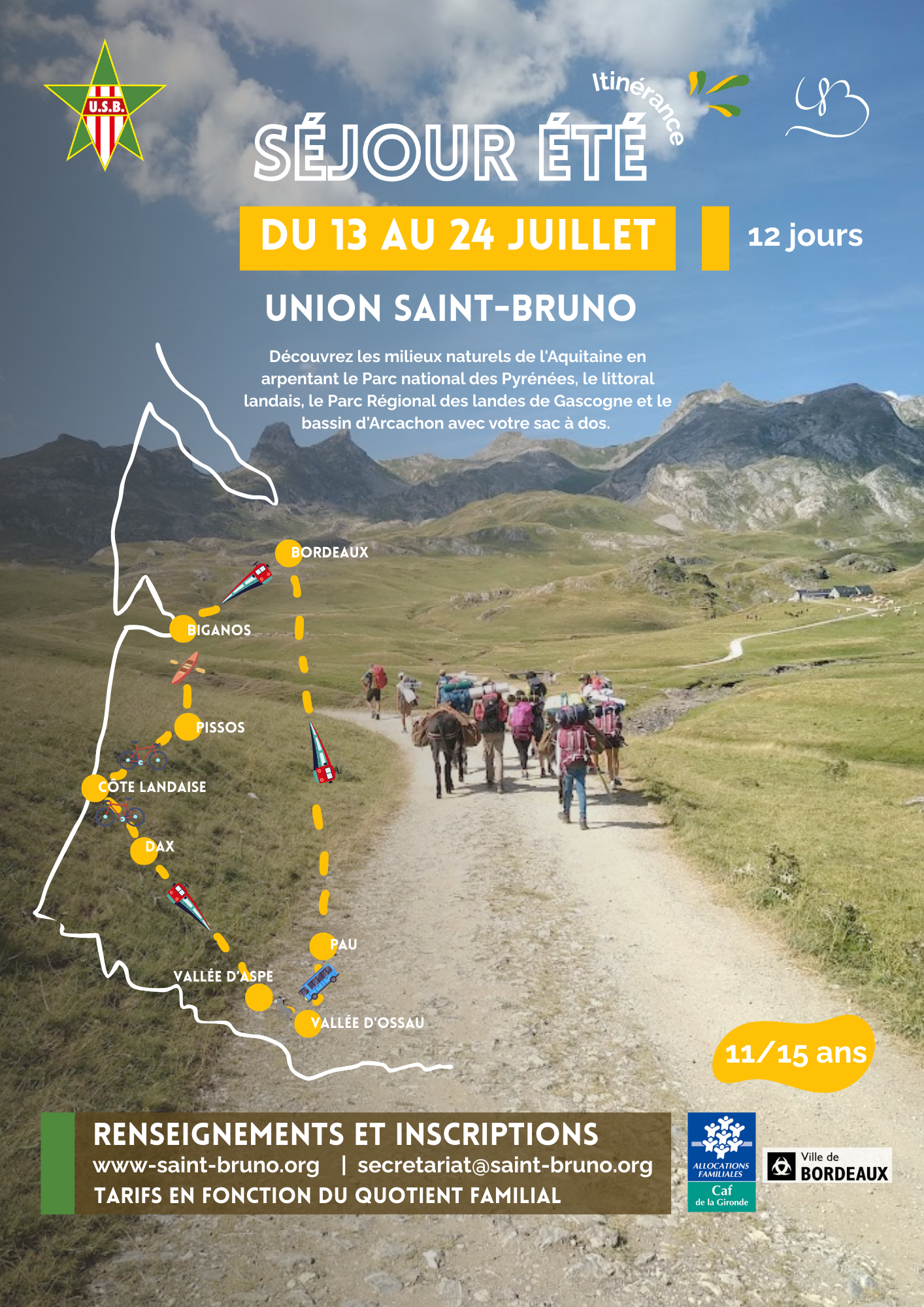 À pied, en vélo, en train, en car, en canoë, le Club Ados propose une nouvelle aventure pour l'été 2026... Au programme une traversée de l'Aquitaine et ses paysages naturels : le parc national des Pyrénées, la côte landaise, le parc régional des landes de Gascogne et le bassin d'Arcachon. Du 13 au 24 Juillet 2026, nous partirons avec 16 jeunes (11/15 ans) pour une itinirance exceptionnelle. Nous alternerons les modes de déplacement, toujours équipés de nos sac à dos, et chaque jour sera l'occasion d'une nouvelle rencontre.