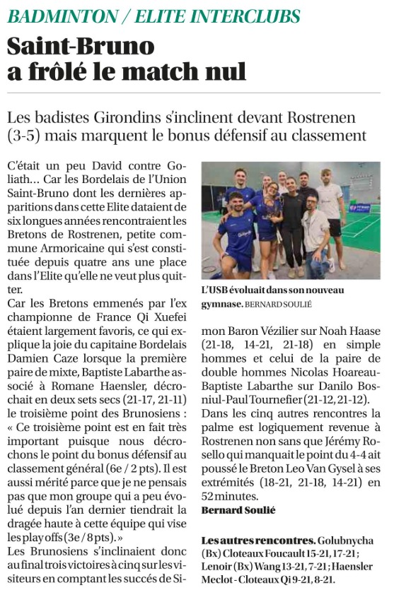 En TOP12 les joueuses et joueurs ont arraché le point défensif en s'inclinant 5 à 3 face à Rostrenen, à l'issue de matchs trés accrochés comme Simon Barron-Vezilier face à Noah Haas en 3 sets. Article presse : ici