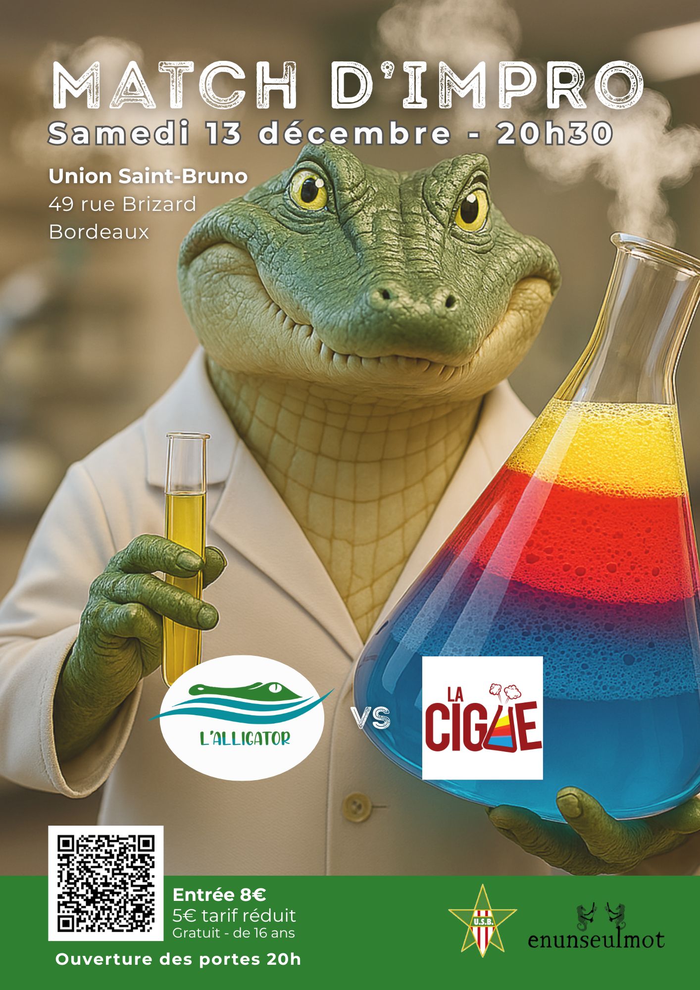Reservation en ligne : https://www.helloasso.com/associations/union-saint-bruno/evenements/match-d-impro-l-alligator