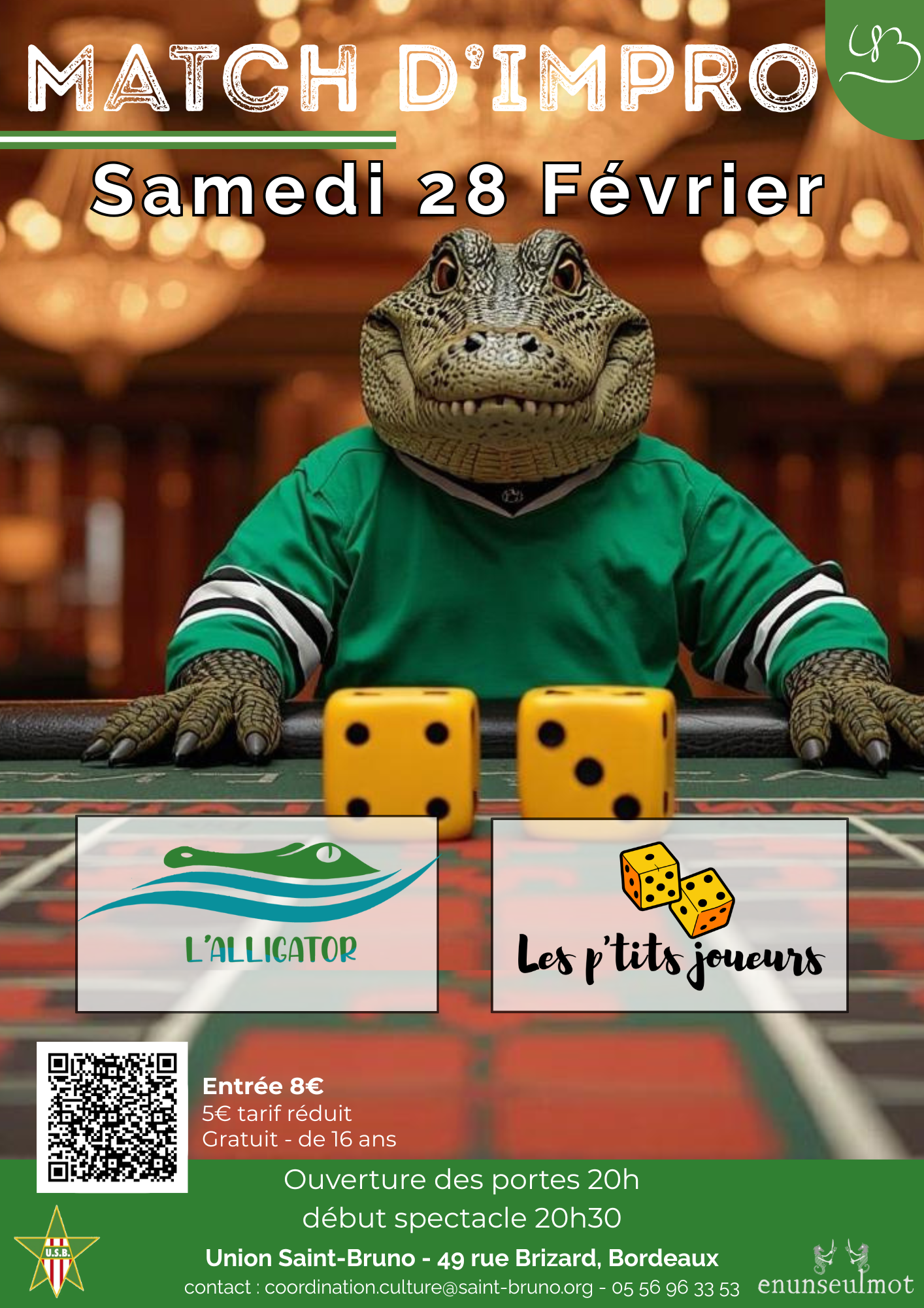 Samedi 28 Février à 20h, nous aurons le plaisir de recevoir la ligue Les p'tits joueurs pour un match d'impro à l'Union Saint Bruno de Bordeaux.