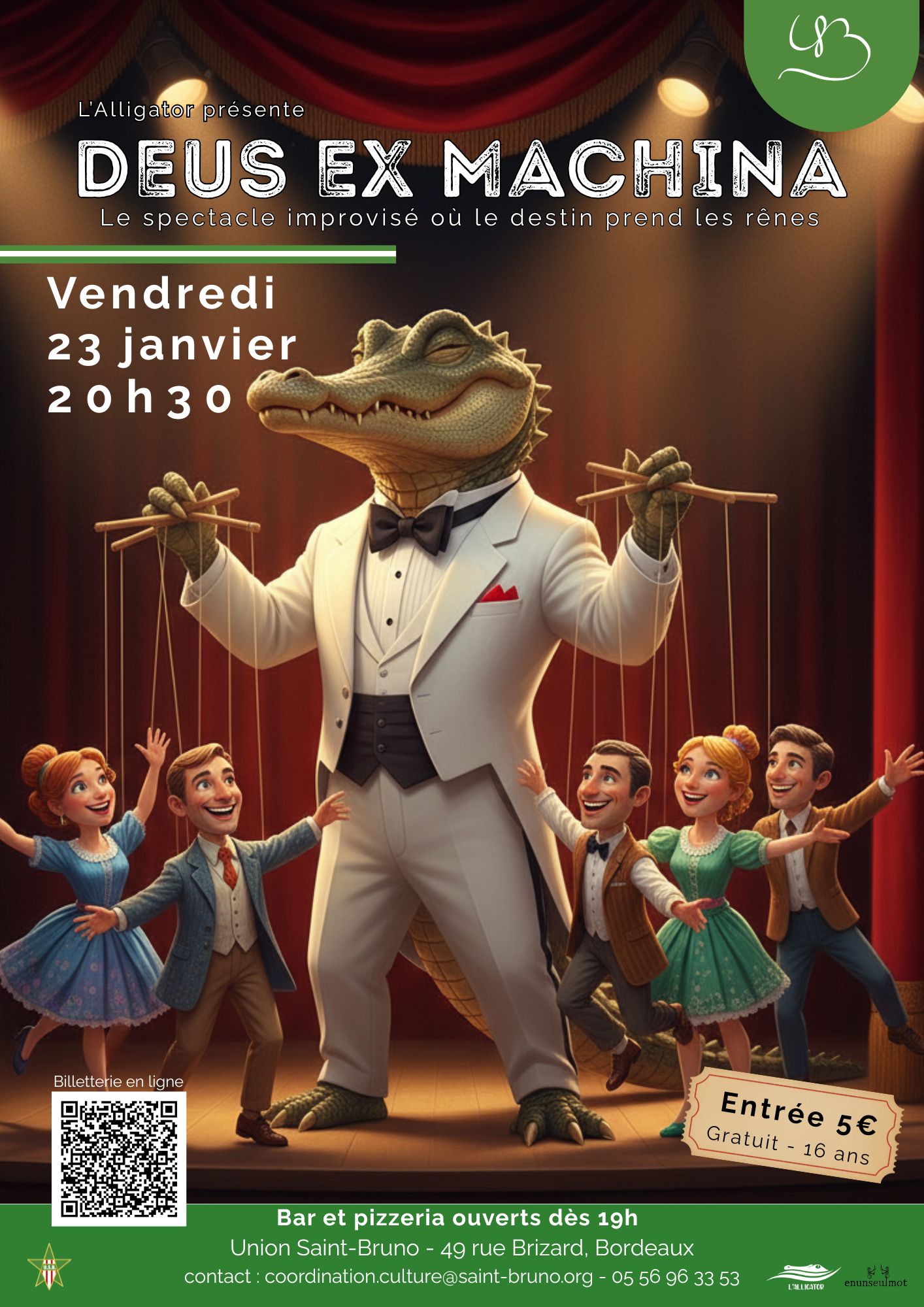 Vous êtes-vous déjà demandé ce qui se passerait si les dieux descendaient de leur piédestal pour orchestrer un spectacle d'improvisation ? Ne cherchez plus, car l'Alligator vous propose un spectacle de choix : le Deus Ex Machina !